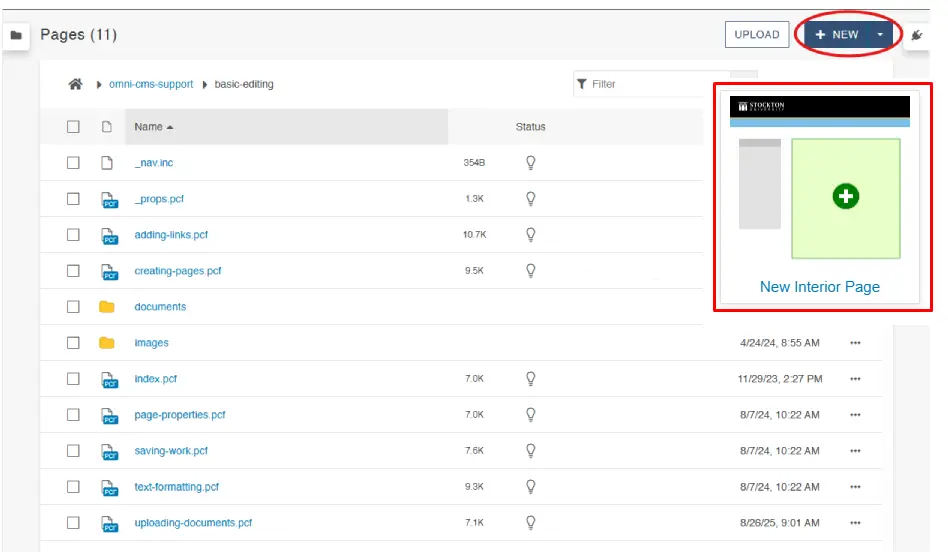 *If you don’t see the button, check whether Focus Mode is turned on. - From the directory view, click New, then select New Interior Page to begin creating your page