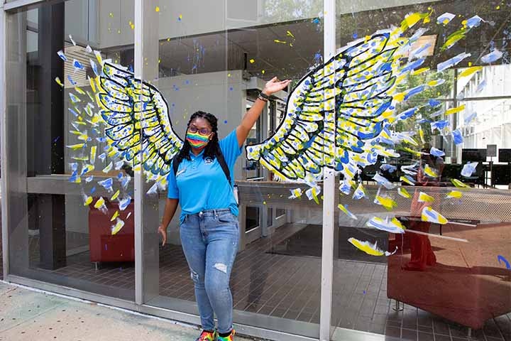 Student Transition Programs wanted to collaborate with the School of Arts and Humanities on a mural “to ignite Osprey spirit among students during New Student Orientation,” explained its director, Ana Edmondson.