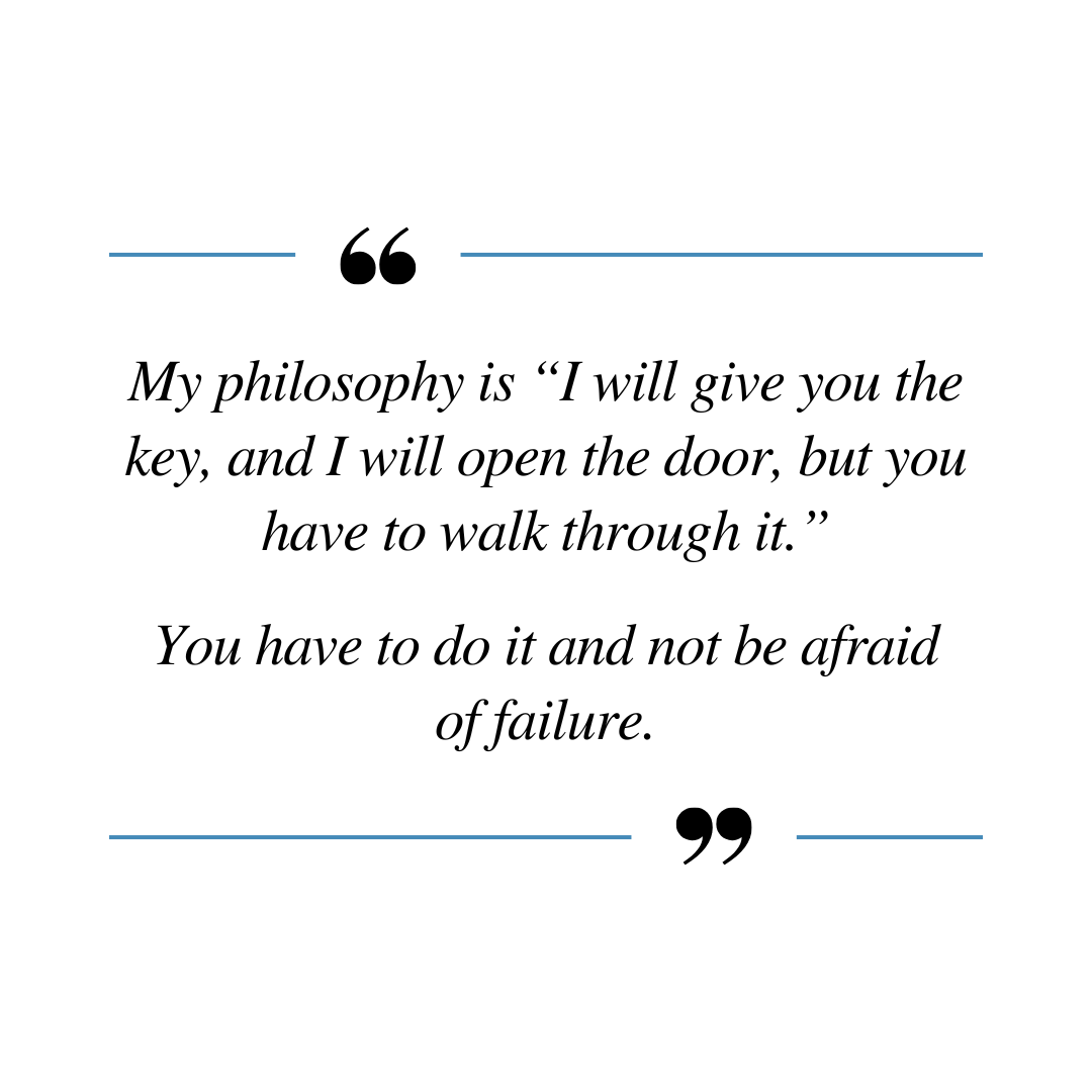 My philosophy is “I will give you the key, and I will open the door, but you have to walk through it.” You have to do it and not be afraid of failure.