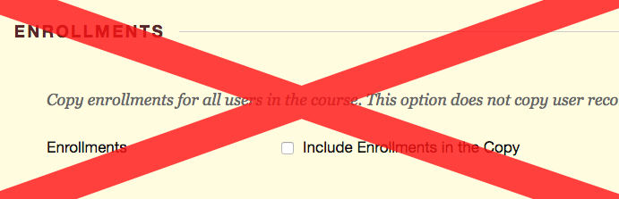WARNING:Do NOT check the box “Include Enrollments in the Copy”. This will copy all current student enrollments into the target course section.