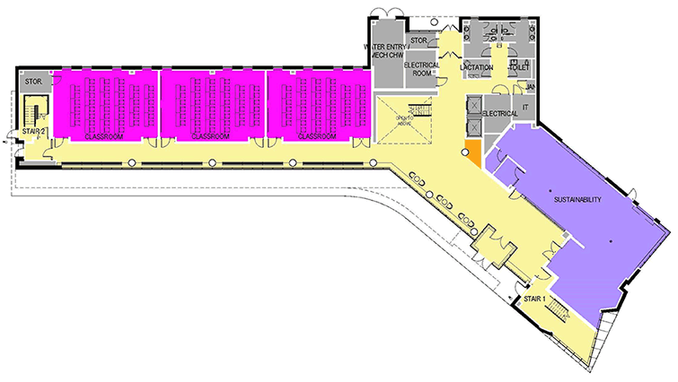 Looking towards the Campus Center, on the left, you will see the brick and glass structure known as the Unified Science Center 2. The three-story building houses teaching and research labs for various disciplines in the sciences, a vivarium, a large greenhouse, a multipurpose room and faculty offices. The 58,210 square foot building is an expansion of the existing 64,000 square-foot Unified Science Center.