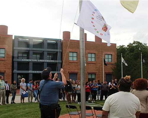 Galloway, N.J. _ Los Latinos Unidos debuted its first Hispanic Heritage Month celebration on Sept. 17 with the raising of a Pan-American flag at the Arts and Sciences building circle.