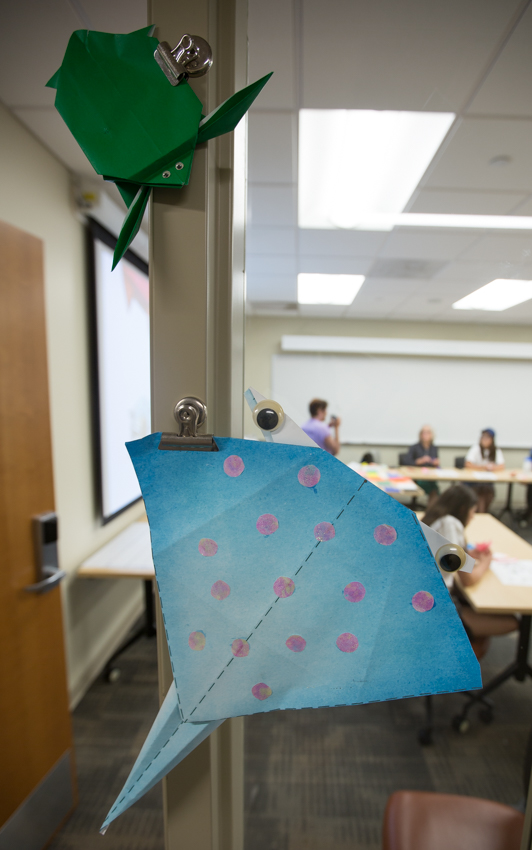 A sea turtle and a stingray greet campers to Norma Boakes's origami workshop.