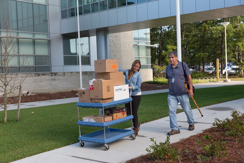 Melissa Laurino and Lester Block cart the terrapins out of the Unified Science Center II for their ride to the saltmarsh.