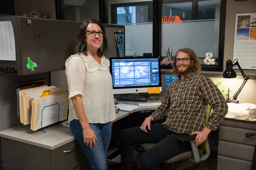 Graphic designers Heidi Hartley and Bernard DeLury show the Photoshop template they built to mimic the K-Wing breezeway dimensions and layout. They combined their creative talents to fill the window space with a variety of bird species and other winged creatures like butterflies and dragonflies in a soaring wave that moves across the windows like a flock of birds.