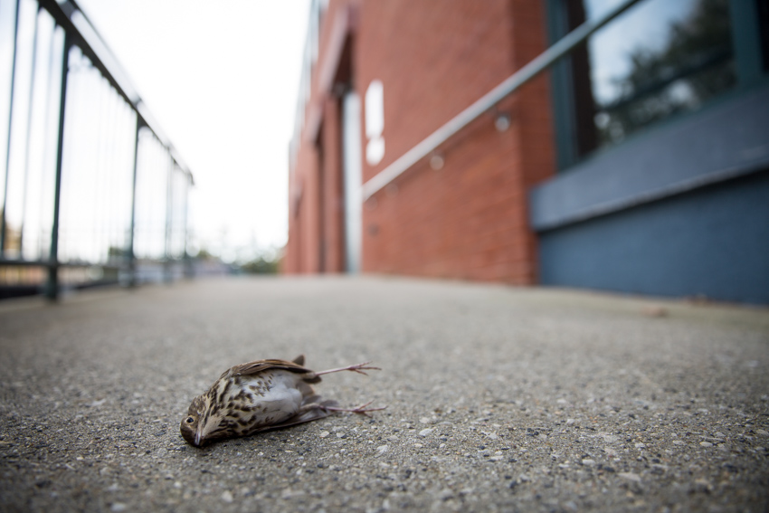 A Hermit thrush lies dead on the ground next to a window it struck during fall migration. Luckier birds that are stunned by window strikes are picked up by caring hands of observant passersby and delivered to John Rokita for rehabilitation.