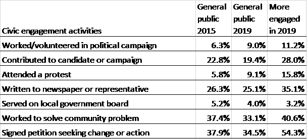 However, when compared with results of a 2015 Stockton poll, the overall percentage of respondents participating in specific civic activities was statistically the same as four years ago.