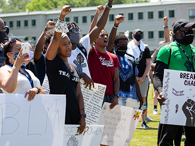 Wristbands bearing the words “Lift Lead Liberate,” that were supposed to be distributed at a March conference for students of color that was cancelled by the COVID-19 pandemic, were also repurposed for the event. Professor of Music Beverly Vaughn got the crowd motivated to march and drummers led the marchers from the Campus Center to the athletic field, keeping the beat as the crowd chanted and walked.