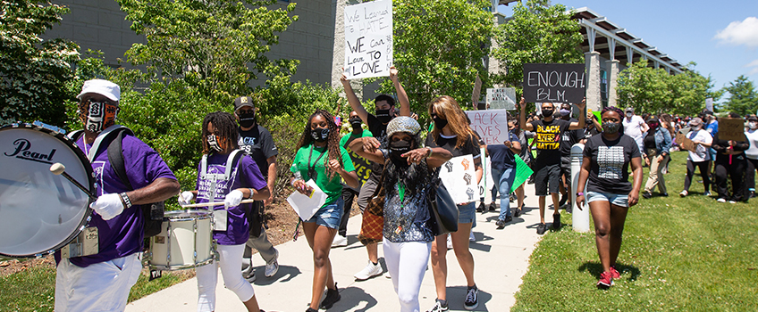 Led by drummers, participants in the Juneteenth March for Justice walk from the Campus Center to the athletic field to do 8 laps around the track in memory of George Floyd.