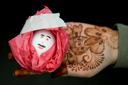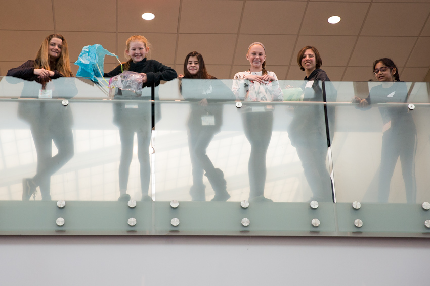 Countdown 3, 2, 1…egg drop. Precious cargo was intentionally dropped from the Campus Center balcony to test parachute designs. The engineers anxiously awaited safe landings. Jackie McGuinness, a teacher at Burlington County Institute of Technology, stood alongside a plastic sheet at ground zero of the testing zone. As soon as each egg landed, the girls quickly made their way downstairs to see the results. McGuinness carefully untangled the parachutes and unwrapped the eggs, revealing their painted faces. Teams with cracked eggs went back to analyze where the parachute failed and crafted re-designs.