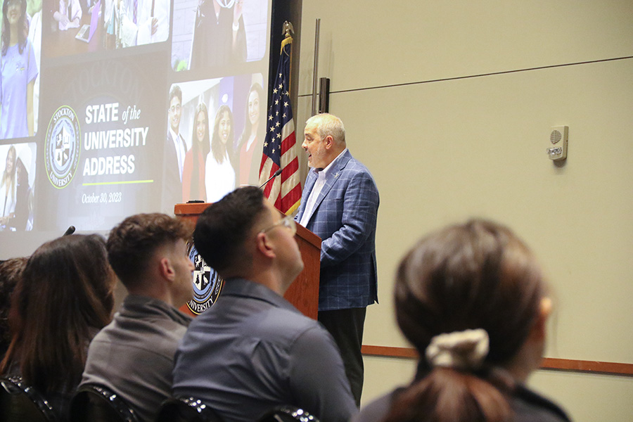 Bertolino, who took office as Stockton’s sixth president on July 1, spoke before a crowd of people in the Campus Center Event Room and on Zoom. He detailed some of the university’s accomplishments over the past year and discussed some of the plans and challenges Stockton faces in the future.