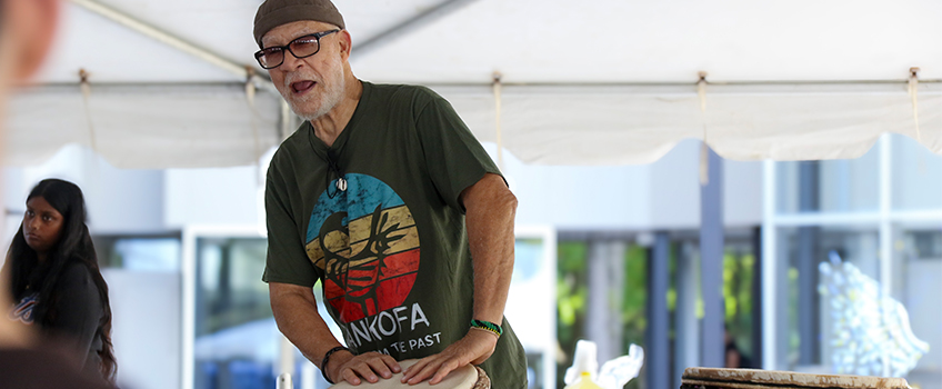 Baba Paul led a drum circle in the plaza outside the Multicultural Center on Tuesday, Sept. 25.