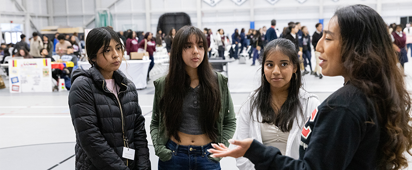 Leilani Moreno-Solano, a Biology major and member of the Chi Upsilon Sigma National Latin Sorority, Inc., talked with prospective students during Stockton University's annual Latino Visitation Day on Tuesday, Nov. 19.