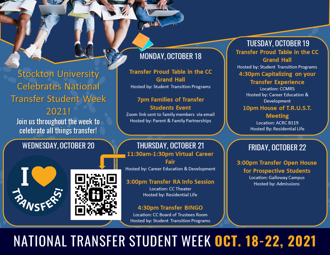 Every year, Stockton University celebrates our transfer students and the transfer experience through a week long schedule of events in October. These events are collaborative efforts from offices across the University, and are open to any transfer student whether you transferred to Stockton this semester or previously!